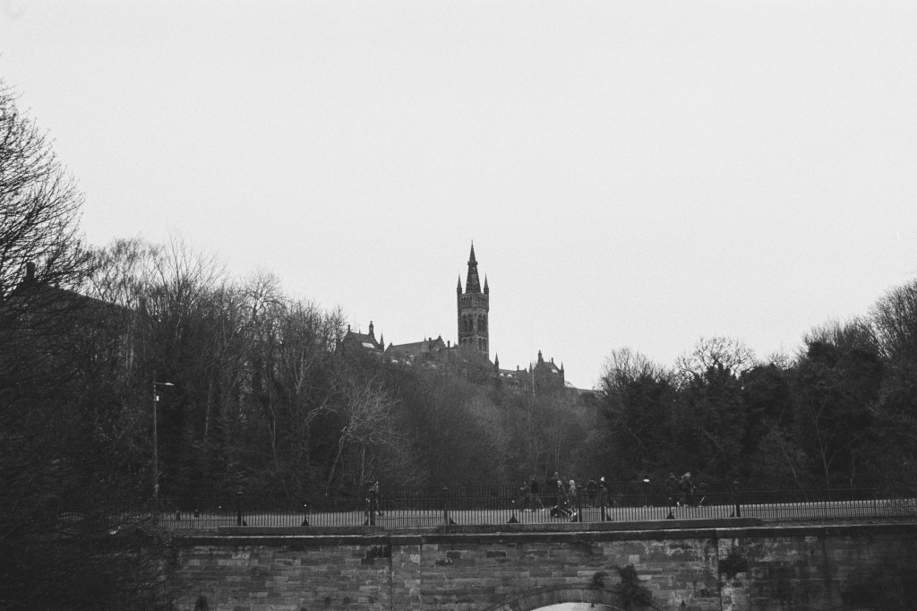 A quintessential West End photograph of the Glasgow university tower breaking a very grey skyline