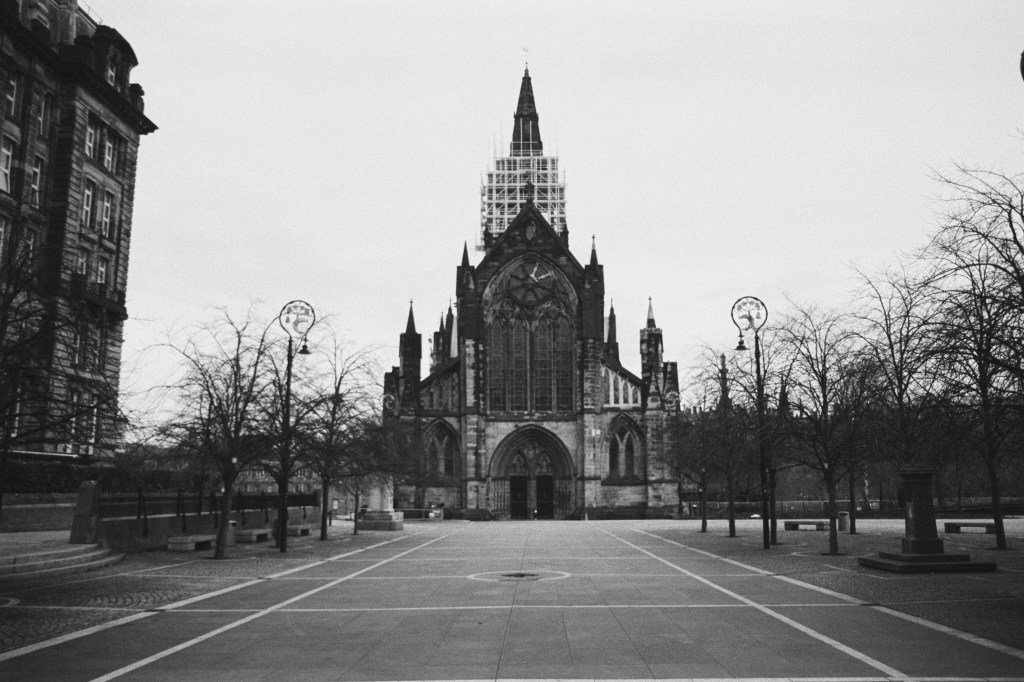 Glasgow’s Ancient Cathedral framed by buildings of different vintages (something something onwards march of student flats in Glasgow)